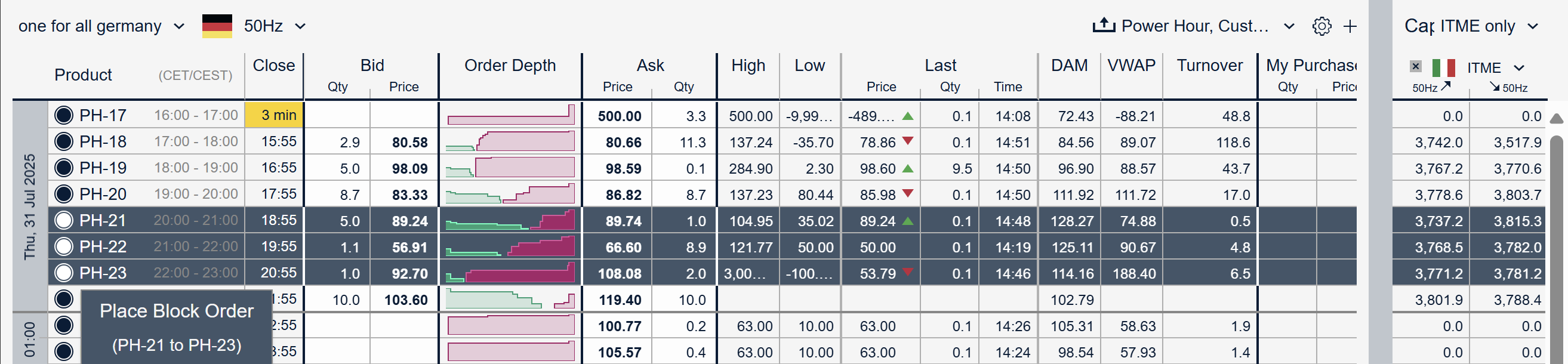 Create a block order by holding Shift Key and selecting the hours you like to include in your block order. A drop down will show the block you have selected. Click “Place Block Order” to open the Order Management window