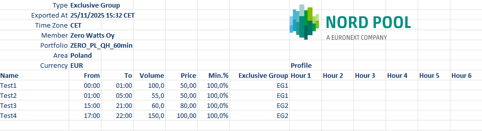 - Enter Exclusive Group order in the Excel template by filling in name, from, to, volume, price, minimum acceptance ratio % and Exclusive Group. For detailed description how to fill in Exclusive Group orders, please see this link.